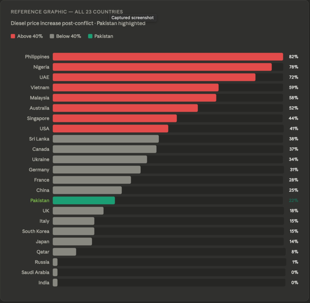 While global diesel prices have surged dramatically, by as much as 82 per cent in some countries, Pakistan has recorded a comparatively modest increase of around 22–25 per cent. This places it among the more stable energy markets at a time when many Asian economies are facing far steeper hikes.