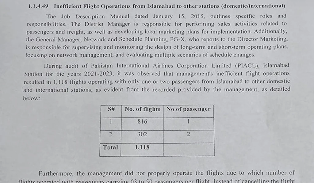 The AGP’s review of PIACL’s Islamabad station revealed that 816 flights carried a single passenger, while 302 flights had only two passengers each. These figures were verified from records provided by the airline’s own management, the audit report said.