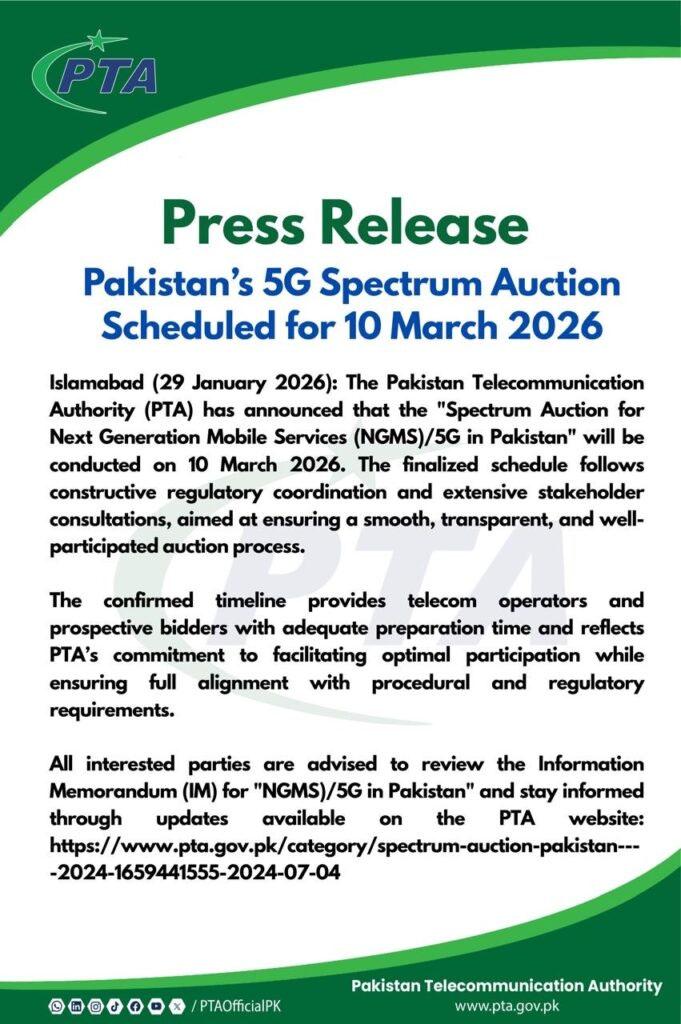 ISLAMABAD: The Pakistan Telecommunication Authority (PTA) announced that the auction for Next Generation Mobile Services (NGMS) 5G spectrum in Pakistan will be held on March 10, 2026.