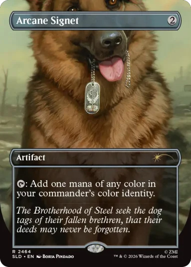 Greet the Dog shines a spotlight on everyone’s favorite companion with Dogmeat, Constant Companion (as Yoshimaru, Ever Faithful), alongside classic utility cards like Arcane Signet and Sol Ring. Foil versions cost $39.99, while non-foil are $29.99.