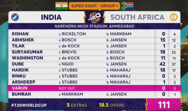 Hardik Pandya, who came in the middle overs, was also being hunted down by Keshav Maharaj, which left the Indian team in quite a difficult time. Dube, however, was able to stay and score 42 off 37 balls, but his innings was of no use as he was the only middle-order all-rounder while chasing the total with the lower order. The team’s top batter, Ishan Kisha, was hunted down for a duck while Abhishek was allowed to score only 15 off 12 balls. Following a massive blow to the team, the team’s Skipper Suryakumar Yadav, also came under pressure after fearing an injury in the right side of the lower body, managing only 18 off 22. Tilak Varma jerked the chase for a digit before being crushed.