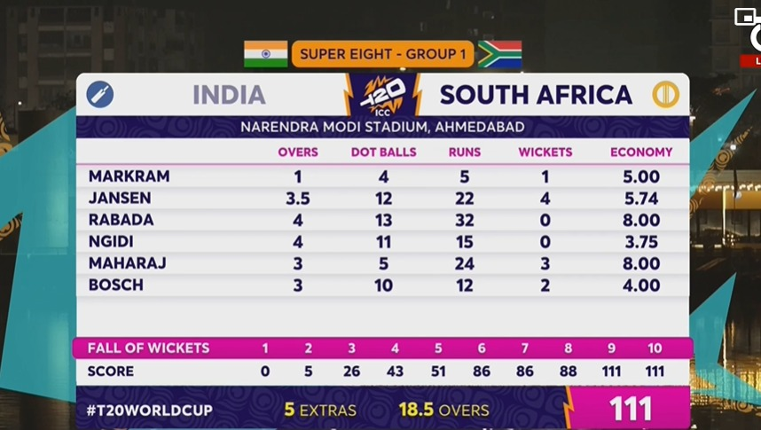 AHMEDABAD: A strong bowling line of South Africa secured a 76-run win over India, after David Miller (63 runs) powered their team to a 187-run target in the 3rd Super Eight clash of the ICC Men’s 2026 T20 World Cup tonight. South Africa’s team ensured a strong defence that enabled them to win SA VS IND clash.
