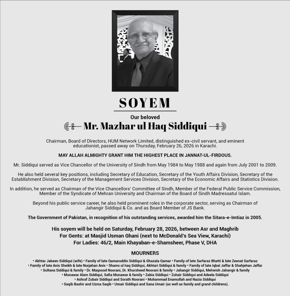 WEB DESK: The soyem of Mazharul Haq Siddiqui, Chairman of the Board of Directors of HUM Network and one of Pakistan’s most senior civil servants, will be held in Karachi today.