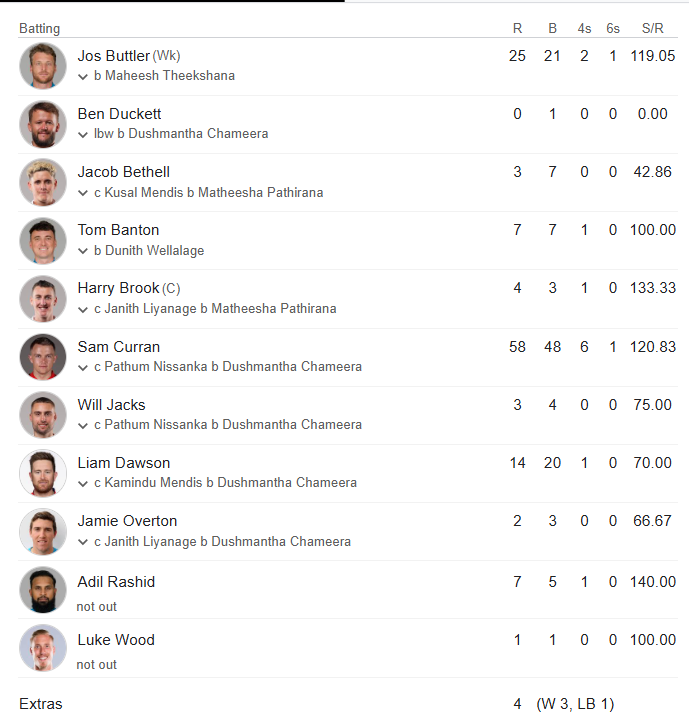 After England posted a modest total of 128-9, their bowlers struck early, sending Sri Lanka reeling. Will Jacks led the charge with three crucial wickets, while Adil Rashid chipped in with two scalps, leaving the visitors struggling for stability.