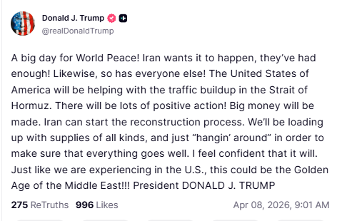 “There will be lots of positive action,” Trump wrote, adding that economic opportunities could follow de-escalation. He suggested reconstruction efforts in Iran could begin soon, with the United States preparing to supply goods and maintain a presence to oversee stability. “We’ll be loading up with supplies of all kinds… to make sure that everything goes well,” he said.