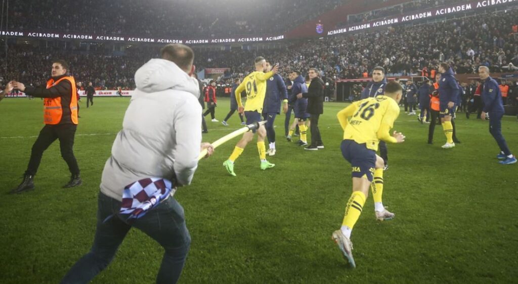 Trabzonspor fans stormed on to the pitch after the final whistle on Sunday and attacked visiting Fenerbahce players who fought back to defend themselves.
