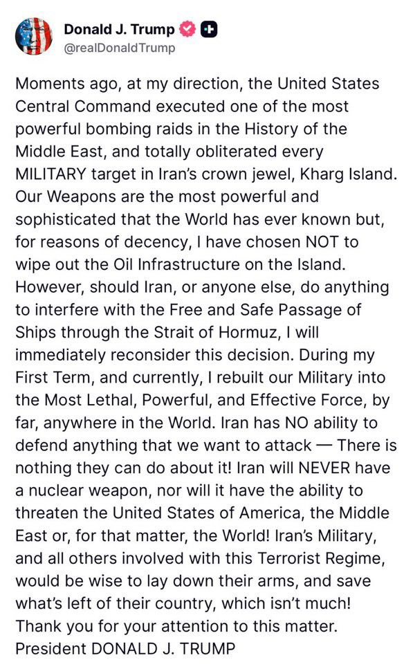 “I chose not to destroy the island’s oil infrastructure for now,” the president stated. “But if Iran, or anyone else, threatens the free and safe passage of ships through the Strait of Hormuz, that decision will change immediately.”