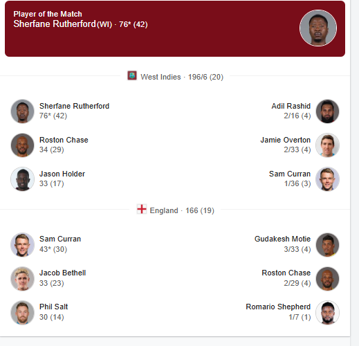 Electing to bat first, the West Indies lost early wickets as Brandon King (1) and skipper Shai Hope (0) fell cheaply. But Rutherford rose to the occasion, playing a masterclass of aggressive T20 batting, smashing 7 sixes and 2 fours in his 42-ball unbeaten 76. He was ably supported by Jason Holder (33 off 17) and Rovman Powell (14 off 13), pushing West Indies to 196-6 in 20 overs. Extras from England, including 14 runs, further boosted the total, leaving England a tough chase of 197.