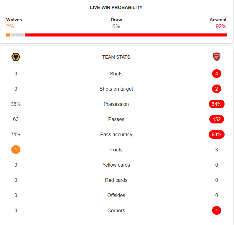Arsenal have controlled much of the tempo, circulating the ball with purpose and patience. Their dominance in possession reflects a side conscious of what three points could mean. A breakthrough goal has given them the edge, but the margin remains fragile.