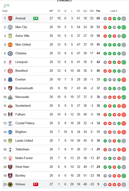 As the match continues, one thing is clear: this is more than a game. It’s a chapter in a title race at the top, a European chase in the middle, and a survival battle below. The table looms over it all.
