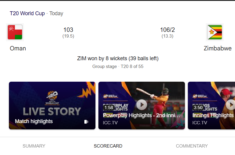 COLOMBO: The eighth match of the ICC T20 World Cup saw Zimbabwe register a narrow eight-run victory over Oman, as fans at the stadium witnessed a low-scoring contest in the ZIM VS OMA clash on Friday. In contrast, Scotland earlier secured a dominant 73-run win after posting 207 runs against Italy.