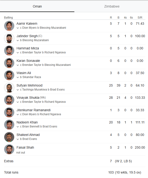 Oman’s batting never gained momentum as Zimbabwe’s bowlers maintained pressure throughout the innings, eventually bundling them out for a modest total.