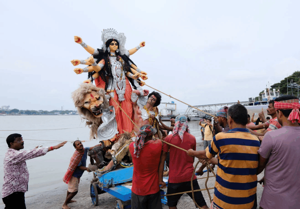 Videos and images from the event showed Durga, seated atop her lion, wielding celestial weapons in her ten hands, confronting a Trump-like demon figure. The installation quickly drew public attention and sparked discussions across social media.