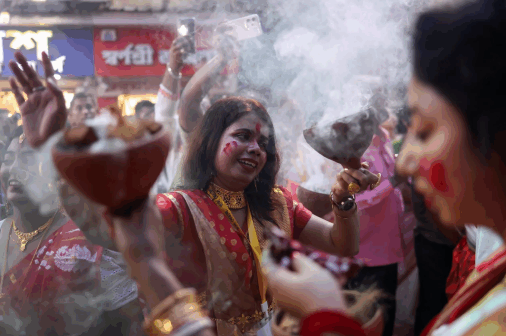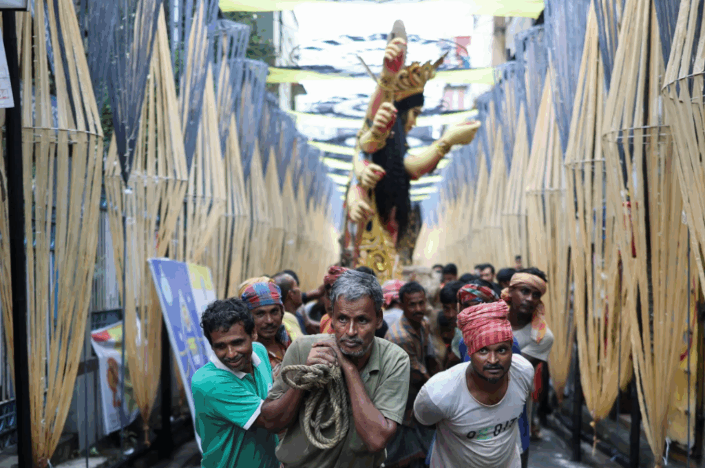 The five-day Durga Puja celebrations transformed entire neighborhoods into sprawling art exhibitions, with organizers using the mythological battle between goddess and demon to channel contemporary anxieties and global themes.