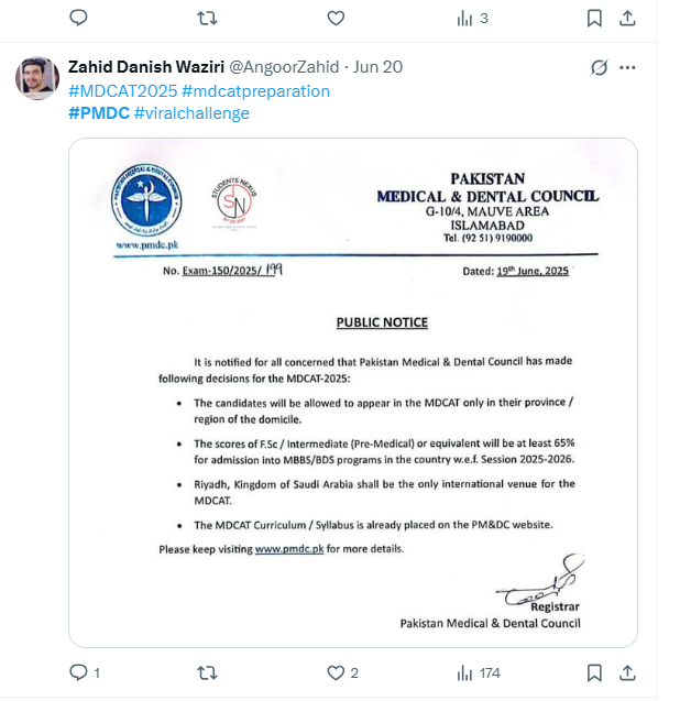 The following decisions were made for the MDCAT-2025 in accordance with a notification issued by the PMDC registrar office on June 2025: