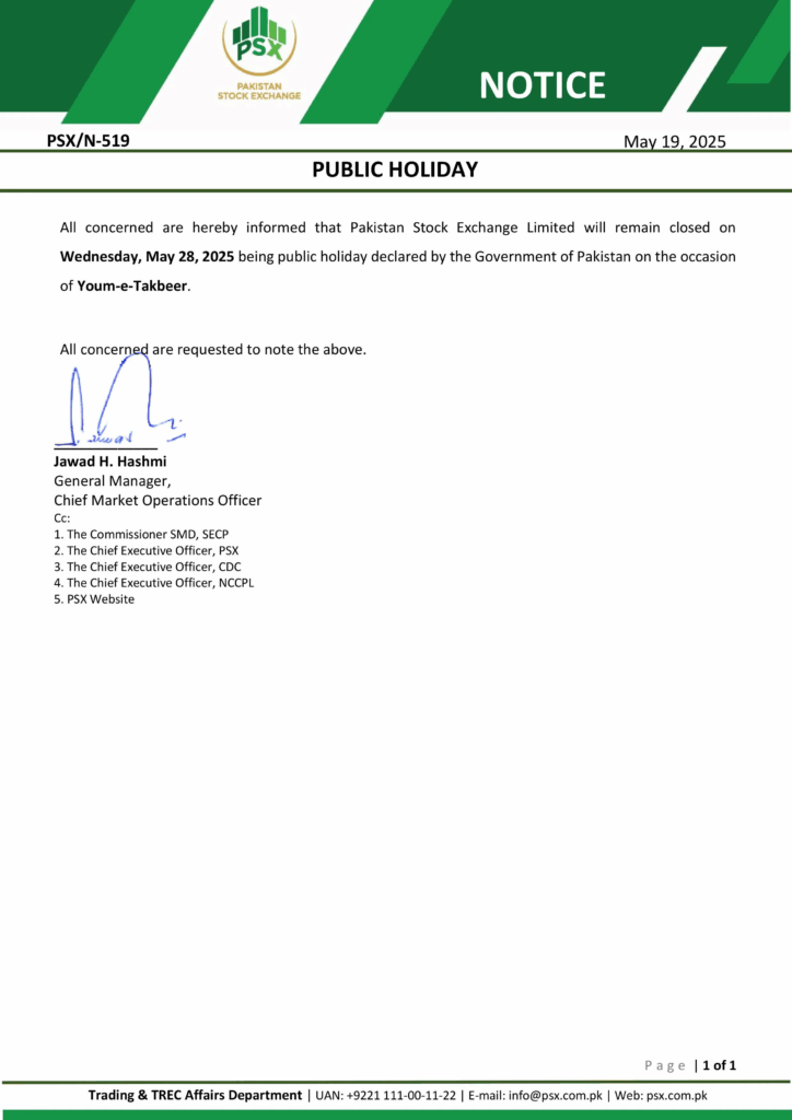 KARACHI: The Sindh government announced that May 28 will be a public holiday to mark Youm-e-Takbeer, commemorating Pakistan’s nuclear tests in 1998.