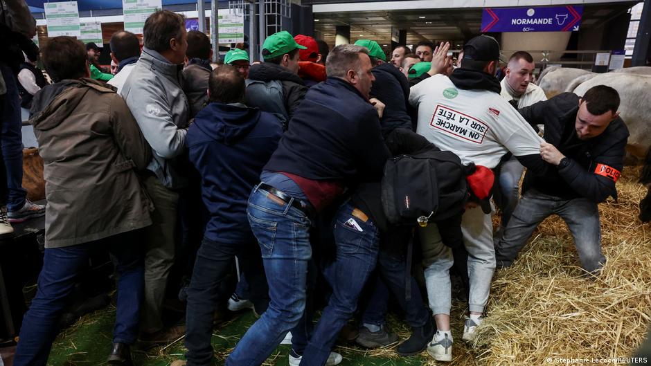 On Friday, French farmers demonstrated in front of the agricultural show, where some camped overnight.