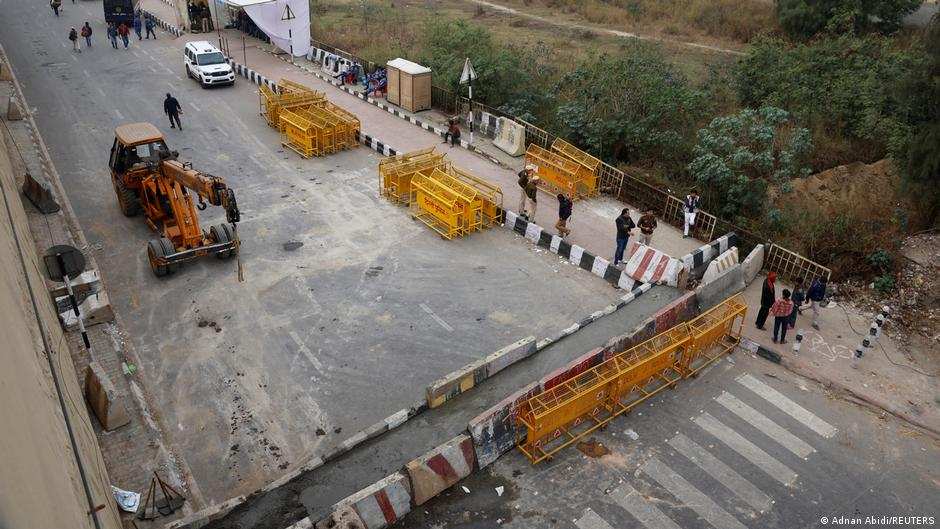 In addition to placing cement blocks and metal spikes along major roads, authorities have also banned gatherings of more than five people in Delhi.