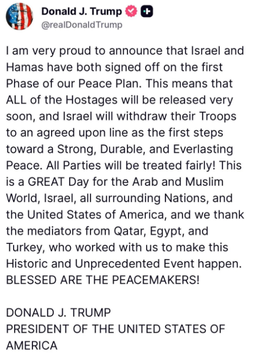 Trump, announcing the deal on his Truth Social platform late Wednesday, said, “I am very proud to announce that Israel and Hamas have both signed off on the first phase of our Peace Plan. This means that ALL of the Hostages will be released very soon, and Israel will withdraw their Troops to an agreed upon line as the first steps toward a Strong, Durable, and Everlasting Peace.”